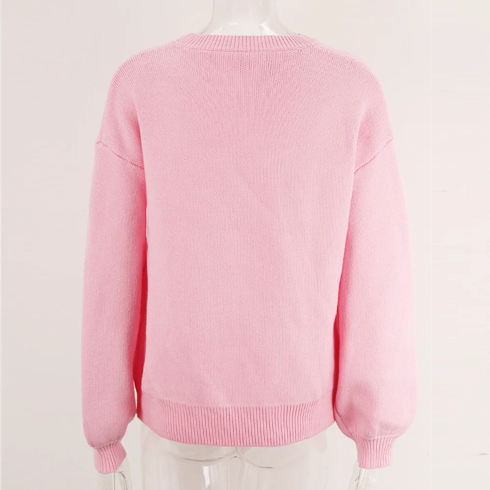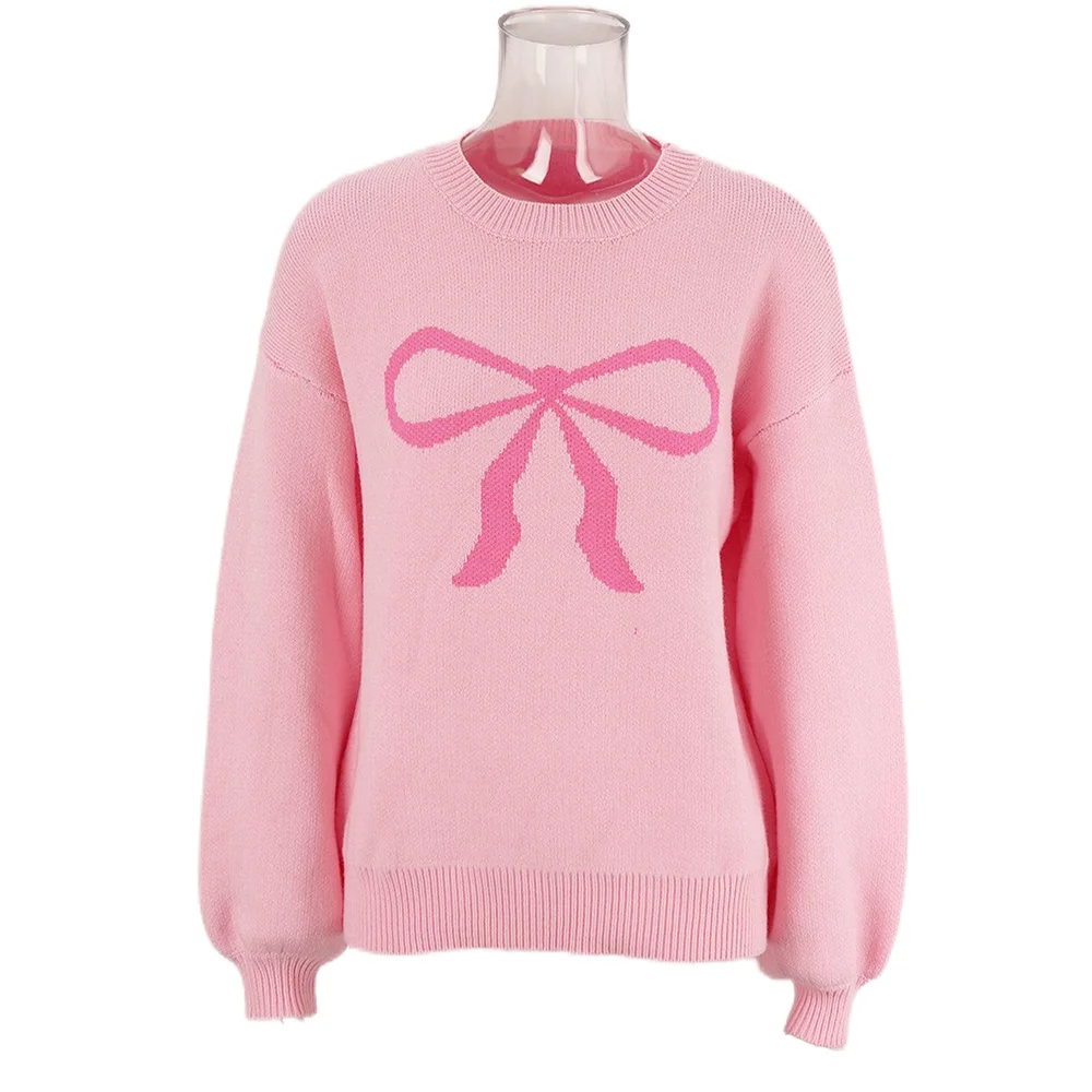 Hot Sale Custom Ladies' Cute Pink Jacquard Bow Picture Knit Pullover Jumper O-Neck Long Sleeve Winter Casual Style Sweater
